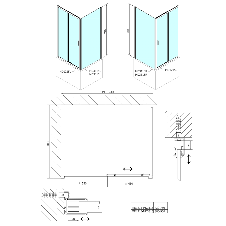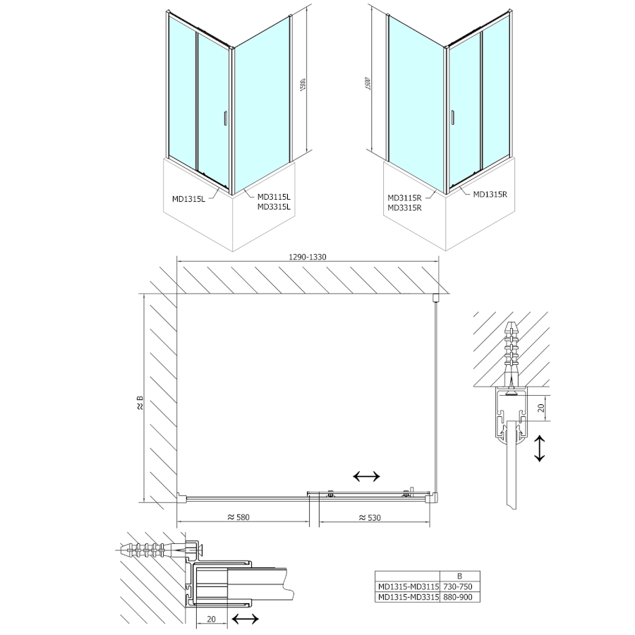 Feste Wand zur Duschtür |