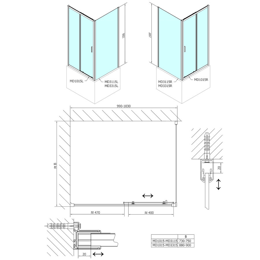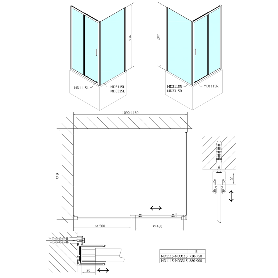 Feste Wand zur Duschtür |