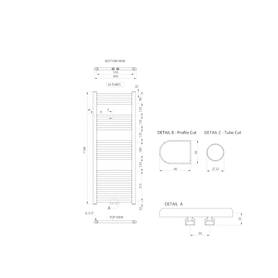 ALYA Badheizkörper gerade 600x1188mm, Mittelanschluss, Chrom
