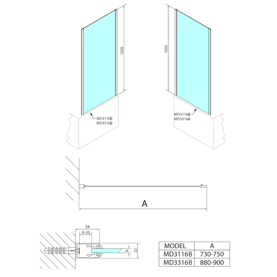 Feste Wand zur Duschtür |